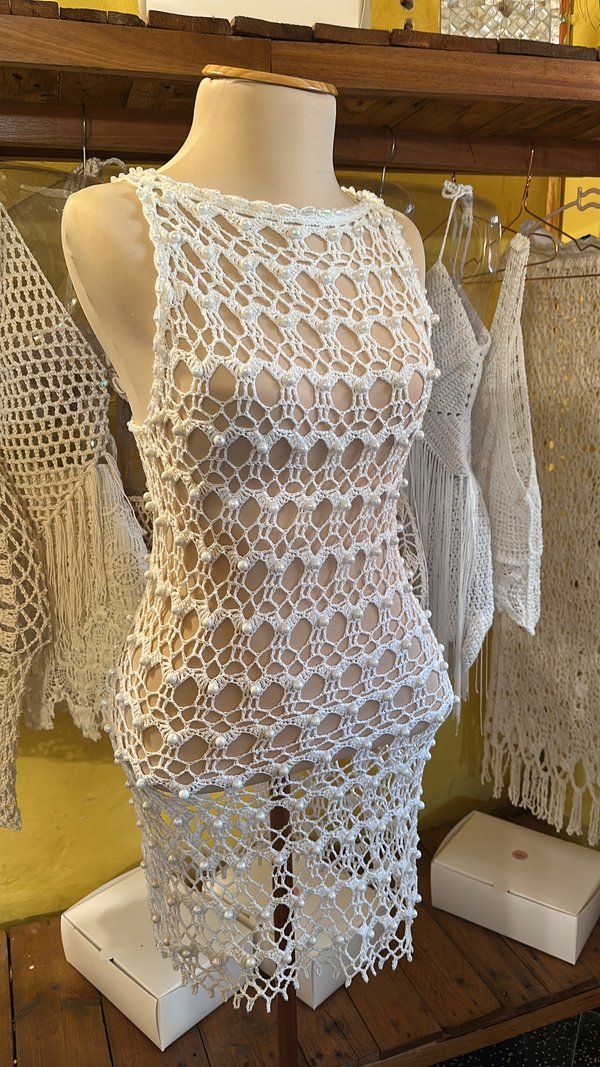Vestido de algodón con perlas en la parte frontal del diseño, ajustable en el cuello