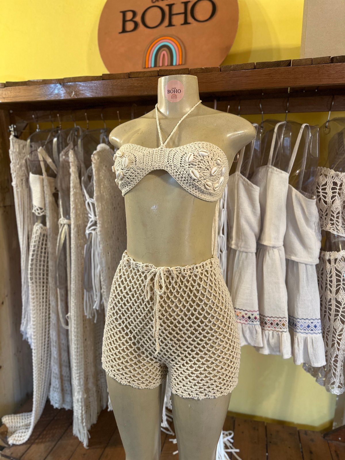 Short y top tejidos en algodón ajustables con apliques de caracoles naturales