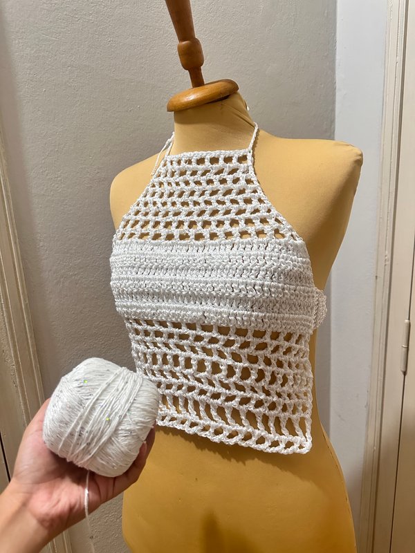 Tejida en algodón ajustable en el cuello y pecho color hueso.